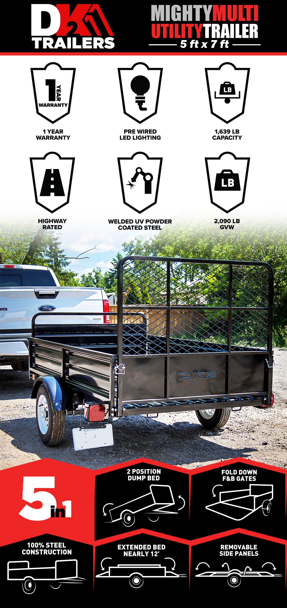 This single axle multi-utility trailer from DK2 is one of the most versatile trailers on the market. Sitting on a solid square tube cambered axle with 12-inch, 6-ply bias tires and a load capacity of 1,639 pounds. Equipped with a 24-inch front load-bearing gate and a 40-inch rear drive-up gate, and a tilt/dump capability that makes it easy to load or unload heavy items. Fabricated from 100% steel, all of the components are reinforced, adjustable, removable and/or interchangeable.