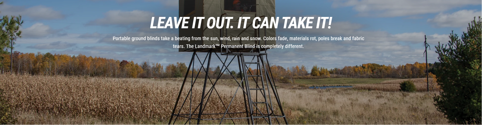 Portable ground blinds take a beating from the sun�� wind�� rain and snow. Colors fade�� materials rot�� poles break and fabric tears. The Landmark Permanent Blind was designed and constructed to resist the elements year after year. The durable steel frame is covered with Marine-Grade Reinforced Synthetic Tarpaulin�� made from the same rugged materials used in pick-up truck Tonneau covers. The windows can be adjusted vertically or horizontally and the door doubles as a window providing nearly a 360-degree shooting radius. If you're looking for an affordable year-round hunting blind with enough room for group hunts and archers�� the Landmark Permanent Blind is for you.